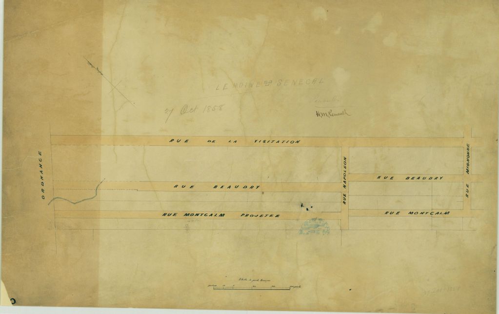 Ce plan représente les propriétés appartenant à Messieurs Lemoine et Sénécal. Ces propriétés sont situées entre les rues de la Visitation, Beaudry, Montcalm, Mignonne et Napoléon (devenue Ontario) à Montréal. Il s'agit des lots n° 1004 à 1145 du cadastre du quartier Saint-Jacques de la cité de Montréal. Les terrains vont jusqu'à l'Ordonnance, soit la ferme Logan au-delà de la future rue Sherbrooke, appartenant au gouvernement provincial. La rue Montcalm est proposée au-delà de la rue Napoléon