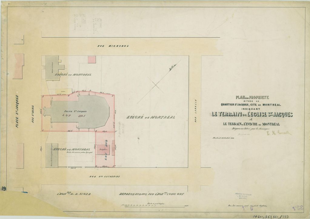 Ce plan présente le terrain de l'église Saint-Jacques entouré par le terrain de l'évêché de Montréal. Ce terrain est situé dans le quadrilatère formé par les rues Saint-Denis, Mignonne, Labelle et Sainte-Catherine. C'est le lot n° 922 du cadastre du quartier Saint-Jacques de la cité de Montréal. L'emplacement au sol de l'église, du presbytère et d'une remise est localisé sur le lot. Les ruines de l'ancien et du nouveau palais épiscopal, une école et une remise sont localisées dans la partie appartenant à l'évêché. Les mesures des diverses parties du lot sont indiquées