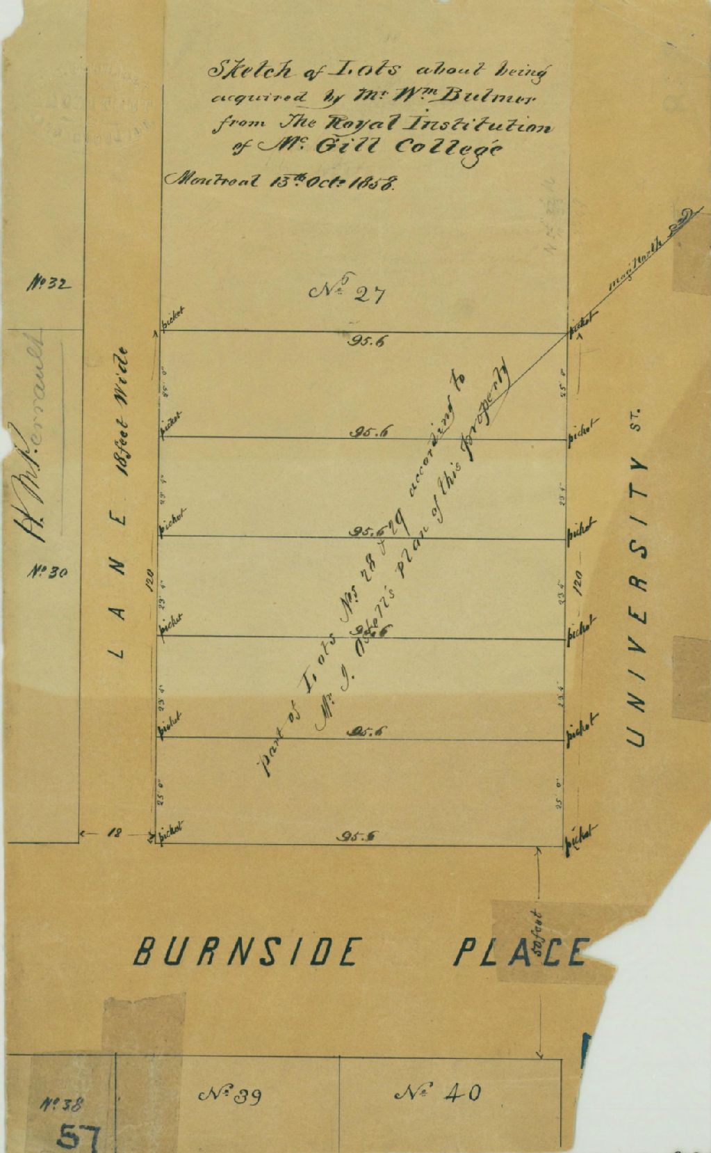 Ce plan comprend les lots que monsieur William Bulmer veut acquérir de la Royal Institution of McGill College. Ces lots sont situés à l'intersertion des rues Université et Burnside Place (devenue boulevard de Maisonneuve) à Montréal. Ce sont les lots n° 27 à 29 de l'ancien cadastre seigneurial du quartier Saint-Antoine soit les n° 1285 à 1290 du cadastre du quartier Saint-Antoine de la cité de Montréal. Les lots n° 28 et 29 sont préparés selon le plan de John Ostell. Les mesures des lots sont indiquées