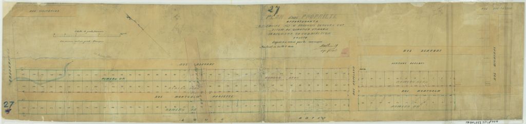 Ce plan présente la propriété située sur la rue Mignonne le long de la rue Beaudry jusqu'aux terres de l'Ordonnance, soit la ferme Logan (devenue le parc Lafontaine), à Montréal. Ce sont les lots n° partie de 974 à 1039 et 1133 à partie de 1155 du cadastre du quartier Saint-Jacques de la cité de Montréal.Les lots sont numérotés de 1 à 133. La rue Ontario est projetée et la rue Montcalm est projetée au milieu des parties de lots. Les voisins sont Louis Boyer et les héritiers Beaudry. Les mesures des lots sont indiquées