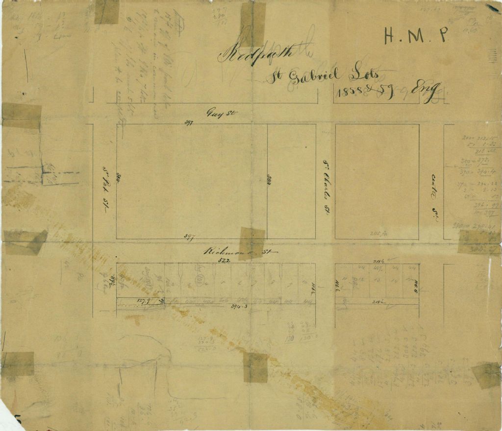 Ce plan donne une partie des terrains appartenant à John Redpath à la ferme Saint-Gabriel. Ces terrains sont situés dans le quadrilatère formé par les rues Centre, Richmond, Saint-Patrick et Guy (devenue Montmorency) à Montréal. Ce sont les lots n° 764 à 759 du cadastre du quartier Sainte-Anne de la cité de Montréal. Les 15 lots sur la rue Richmond sont numérotés et les mesures sont indiquées