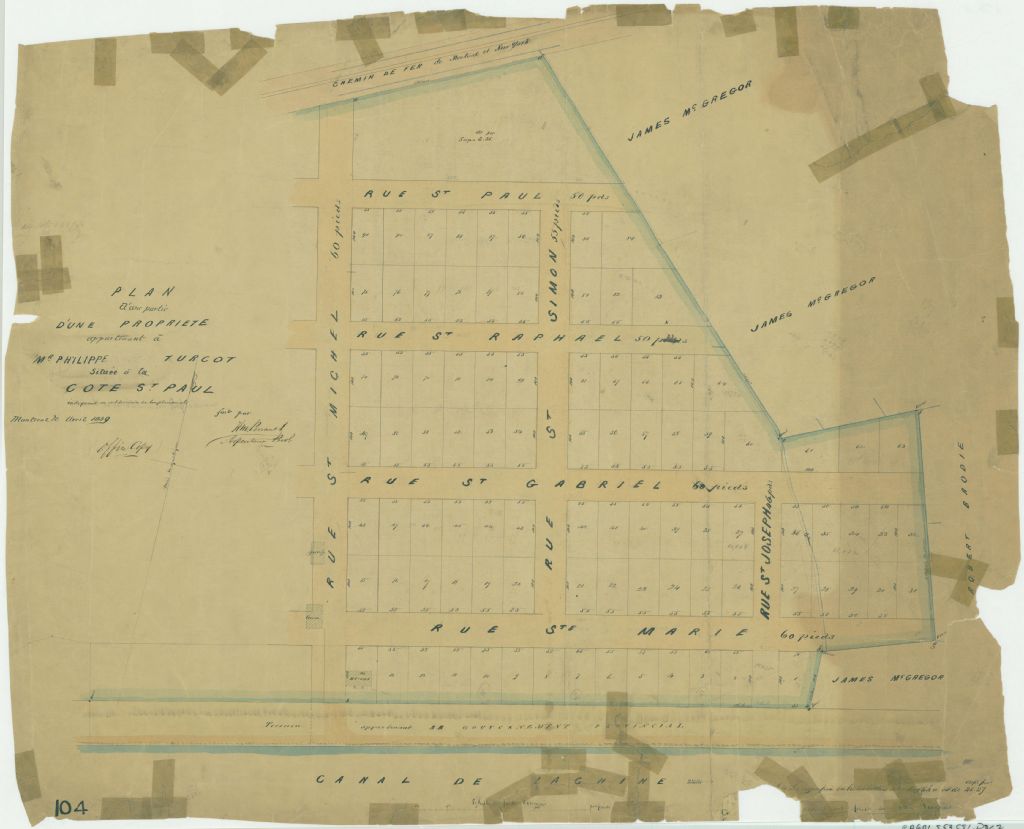 Ce plan présente une partie du terrain de Philippe Turcot. Ce terrain est situé entre le Canal Lachine et la ligne de chemin de fer Montréal et New York. C'est une partie du lot n° 3604 du cadastre de la municipalité de la paroisse de Montréal. Une maison, une écurie et une grange sont localisées près du Canal Lachine. Les mesures des lotissements sont indiquées