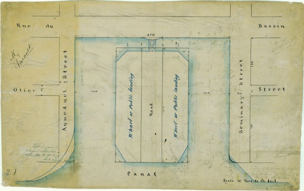 Le plan des travaux devant être exécutés sur la ferme Saint-Gabriel par le ministère des Travaux public représente surtout deux bassins du canal Lachine donnant sur la rue du Bassin entre les rues de l'Aqueduc et du Séminaire. Ce sont les lots n° 1393 à 1395 du cadastre du quartier Sainte-Anne de la cité de Montréal. Le plan présente les modifications aux entrées des deux bassins
