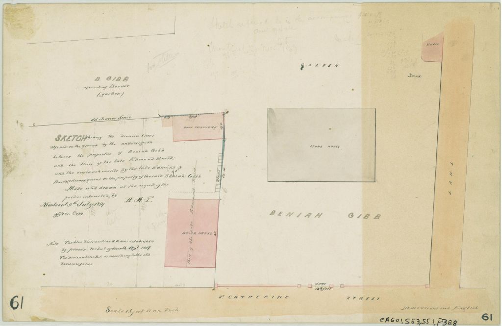Ce plan présente la ligne de division entre les lots de Beniah Gibb et les héritiers de feu Edmund Baird et l'empiètement sur le terrain de Beniah Gibb. Ces lots sont situés sur la rue Sainte-Catherine, près de la rue Saint-Alexandre, à Montréal. Ce sont les lots n° 1167 et 1168 du cadastre du quartier Saint-Antoine de la cité de Montréal.Sur le lot de Beniah Gibb sont localisées une maison de pierre et une étable. Sur le terrain de feu Edmund Baird, il s'y trouve une maison en brique et une dépendance en brique. Les mesures de la ligne de division sont indiquées