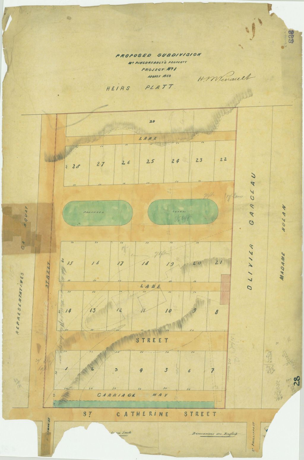 Ce plan représente les terrains, divisés en 28 lots, appartenant à A. Pinsonneault. Ces terrains sont situés à l'intersection de la future rue Saint-Georges et de la rue Sainte-Catherine à Montréal. Ce sont les lots n° 266 à 282 du cadastre du quartier Saint-Laurent de la cité de Montréal. Les voisins sont Madame Nowlan, Olivier Garceau, les représentants Castonguay et les héritiers Platt. Deux squares de forme ovale sont localisés au centre du terrain. Les mesures des lots sont indiquées