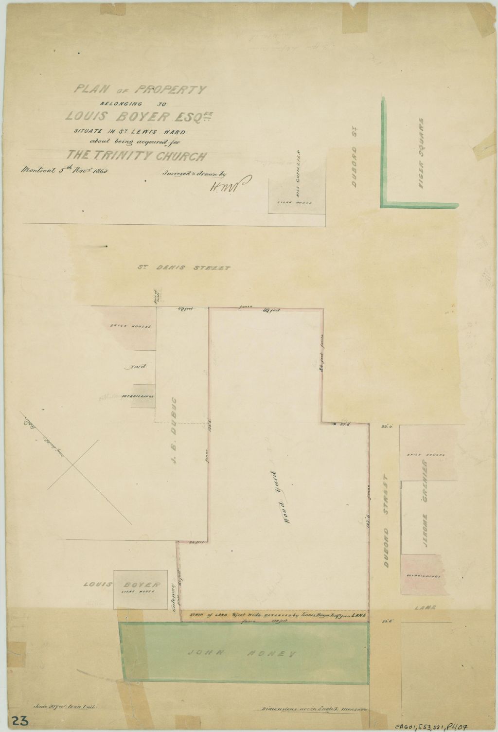 Ce plan présente le terrain appartenant à Louis Boyer. Ce terrain est situé à l'intersection des rues Dubord et Saint-Denis à Montréal. Ce terrain sera acquis pour y construire l'église Trinity. C'est le lot n° 165 du cadastre du quartier Saint-Louis de la cité de Montréal.Le lot était utilisé comme une cour à bois par Louis Boyer. Les voisins sont John Honey, J. B. Dubuc et Jérôme Grenier. Les mesures du lot sont indiquées