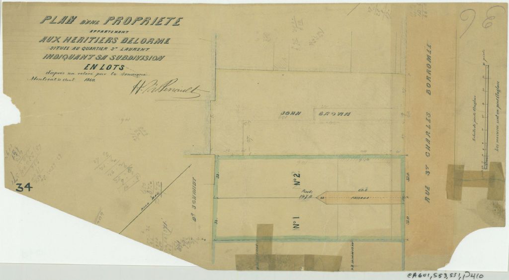 Ce plan présente une propriété appartenant aux héritiers Delorme. Cette propriété est située sur la rue Saint-Charles-Borromée à Montréal. Ce sont les lots n° 813 et 814 du cadastre du quartier Saint-Laurent de la cité de Montréal. Un passage en commun est prévu sur le plan. Les voisins sont H. B. Desmarteau, le docteur S. B. Schmidt et John Brown. Les mesures des deux lots sont indiquées