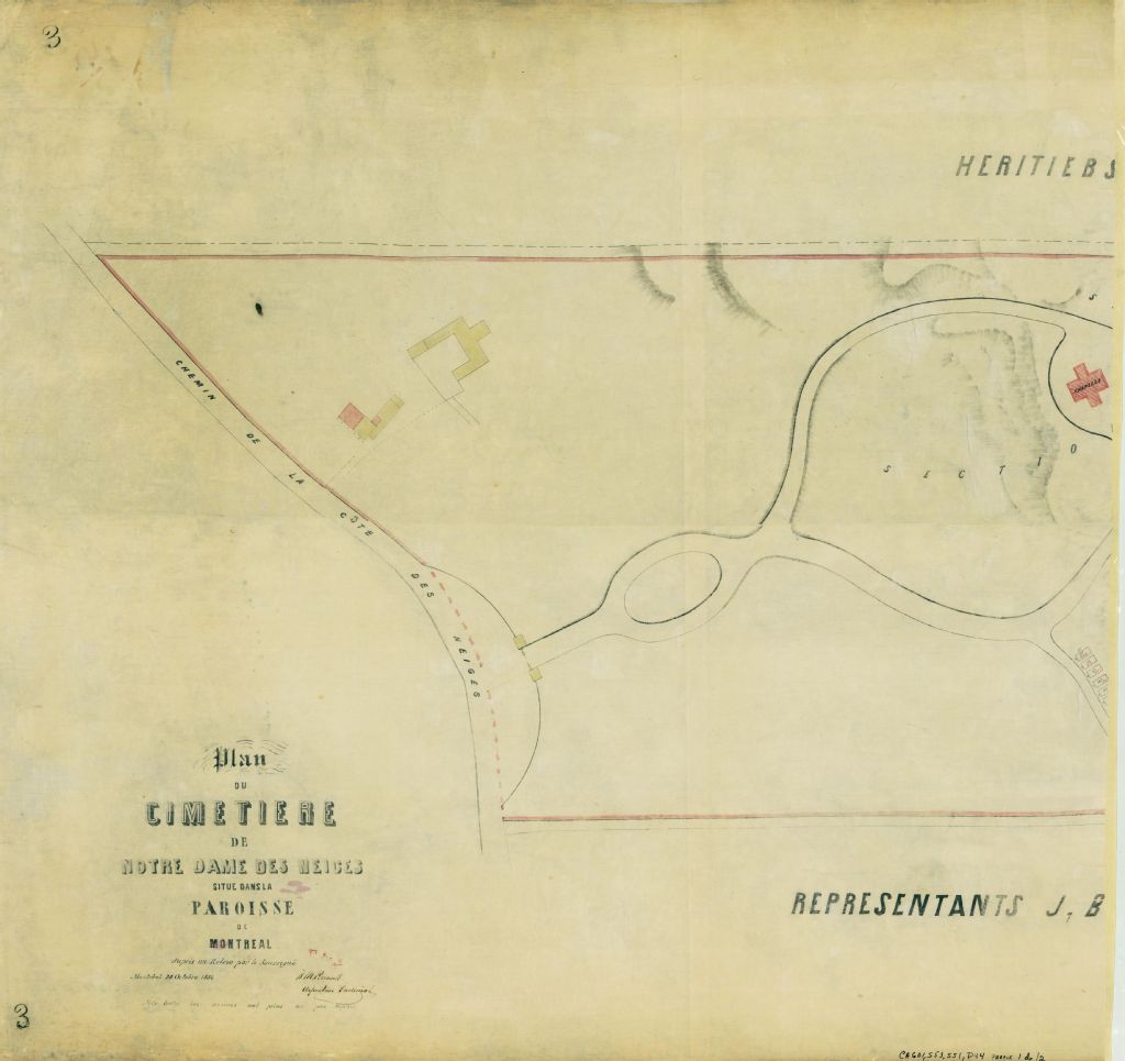Depuis le chemin de la Côte-des-Neiges, le plan représente les divisions des sections A à K du cimetière. Les sections B à F sont divisées en lots ainsi que quelques lots dans la section K. Le cimetière est attenant aux terrains des héritiers Morgan au Nord-Ouest et J. B. Greenshield au Sud-Est. Sont localisés quelques édifices, dont la maison du gardien ainsi que la chapelle