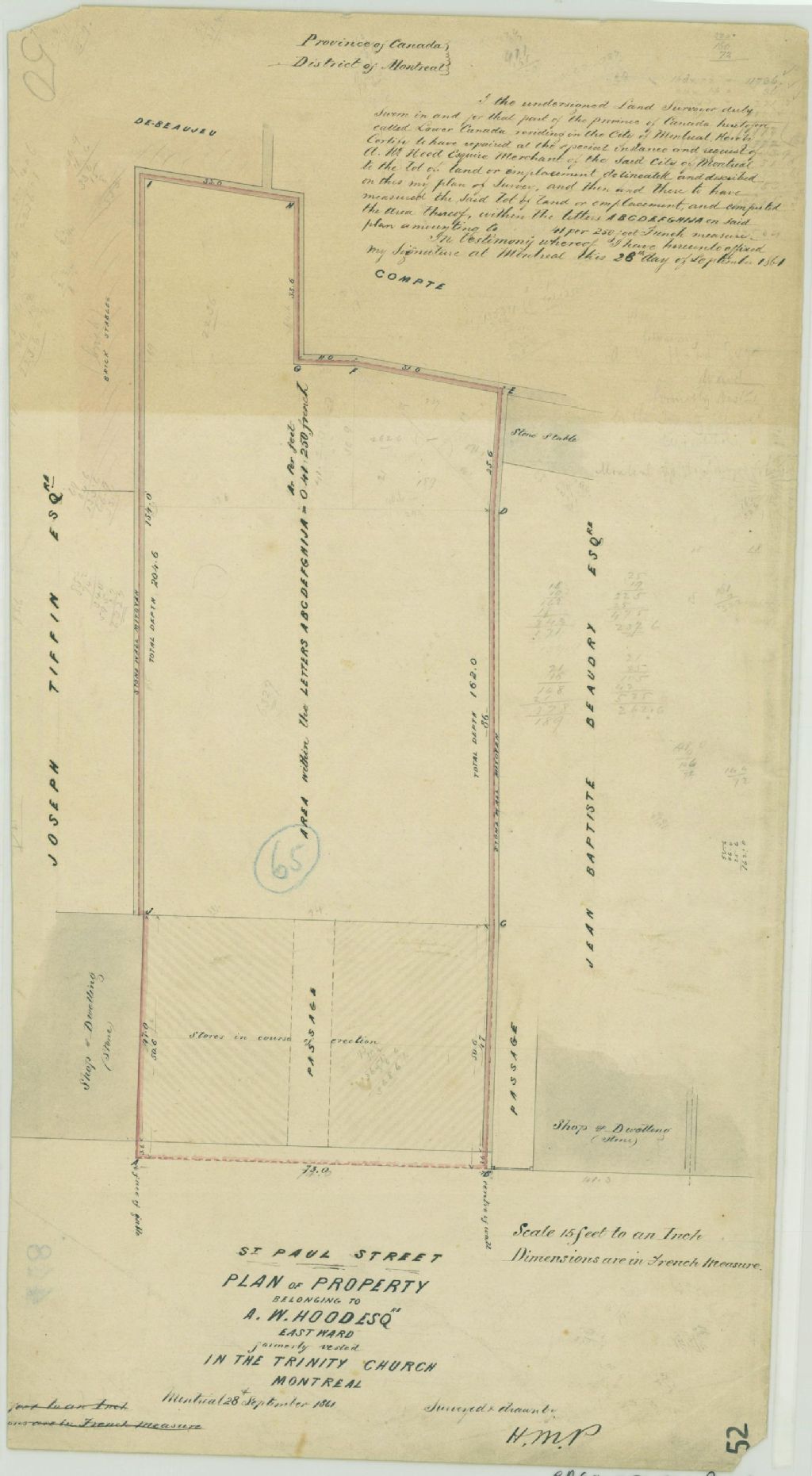 Ce plan présente la propriété de l'église Trinity autrefois appartenant à monsieur A. W. Hood. Cette propriété est située sur la rue Saint-Paul à Montréal. Il s'agit du lot n° 65 du cadastre du quartier Est de la cité de Montréal. Des magasins sont en construction sur le lot. Les voisins sont Joseph Tiffin, Monsieur De Beaujeu, Monsieur Compte et Jean Baptiste Beaudry. Les mesures du lot sont indiquées