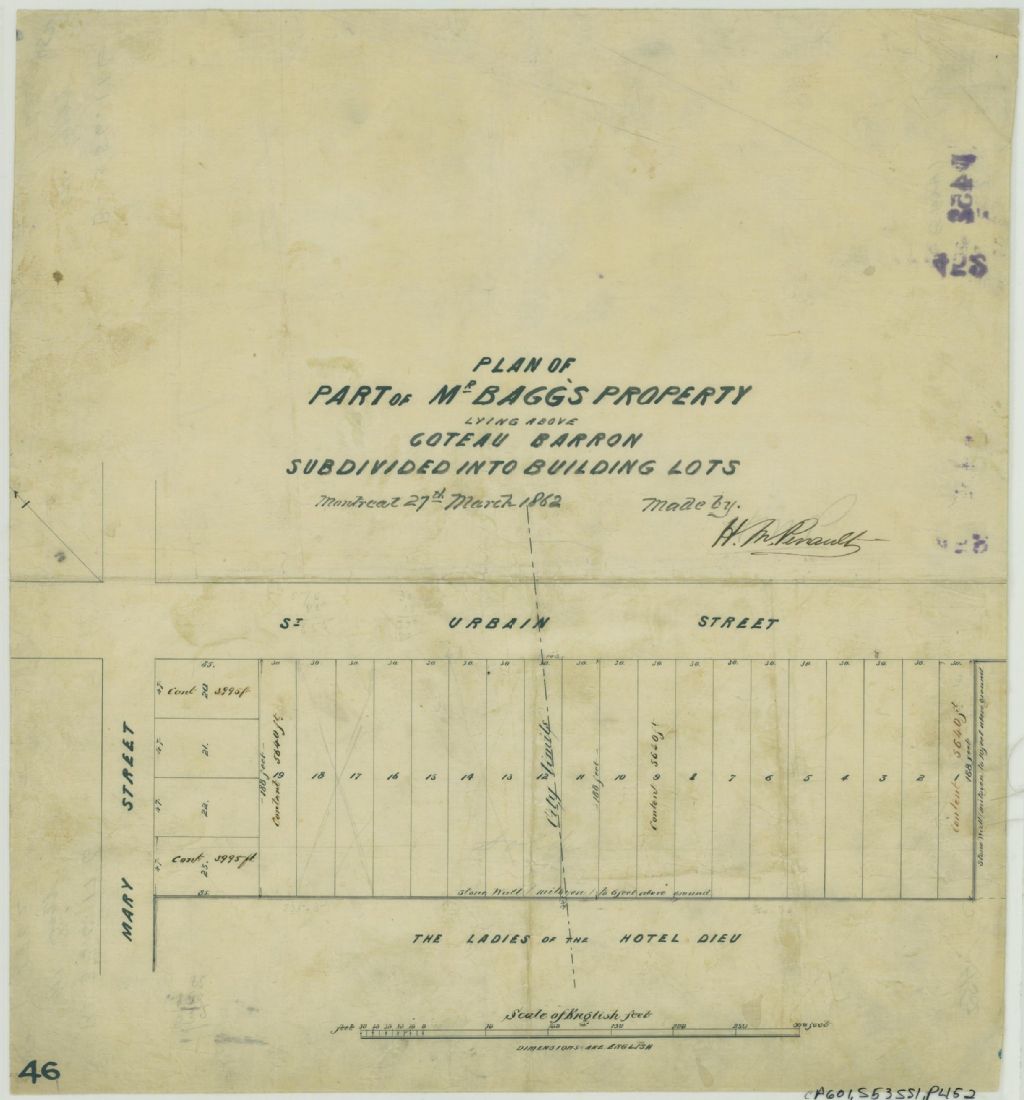 Ce plan présente une partie des terres appartenant à Stanley Clark Bagg. Ces terres sont situées à l'intersection des rues Saint-Urbain et Duluth (appelée par erreur Mary plutôt que Saint-Jean-Baptiste) à Montréal. Ce sont les lots n° 11 du cadastre du quartier Saint-Laurent de la cité de Montréal et n° 434 du cadastre du village de Saint-Jean-Baptiste sur l'île de Montréal. Les mesures des lots sont indiquées
