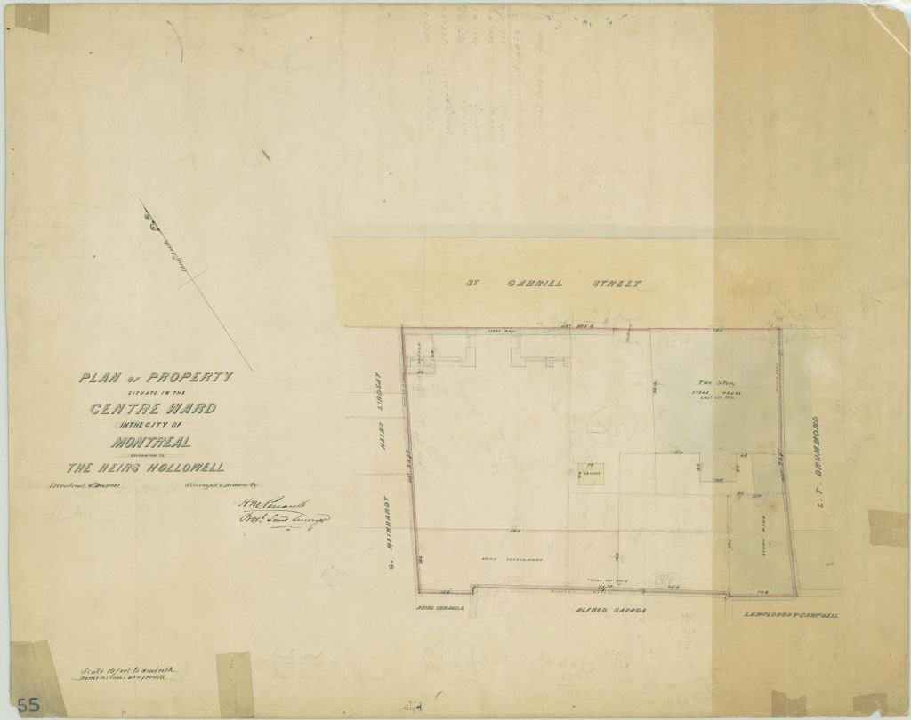 Ce plan présente le lot appartenant aux héritiers Hollowell. Ce lot est situé sur la rue Saint-Gabriel à Montréal. Il s'agit du lot n° 55 du cadastre du quartier Centre de la cité de Montréal. Une maison en pierre de deux étages recouvertes d'étain, un bureau, une remise et des toilettes extérieures sont localisés sur le lot. Les voisins sont L. T. Drummond, Lamplough & Campbell, Alfred Savage, les héritiers Cormick, G. Reinhardt et les héritiers Lindsay. Les mesures du lot sont indiquées