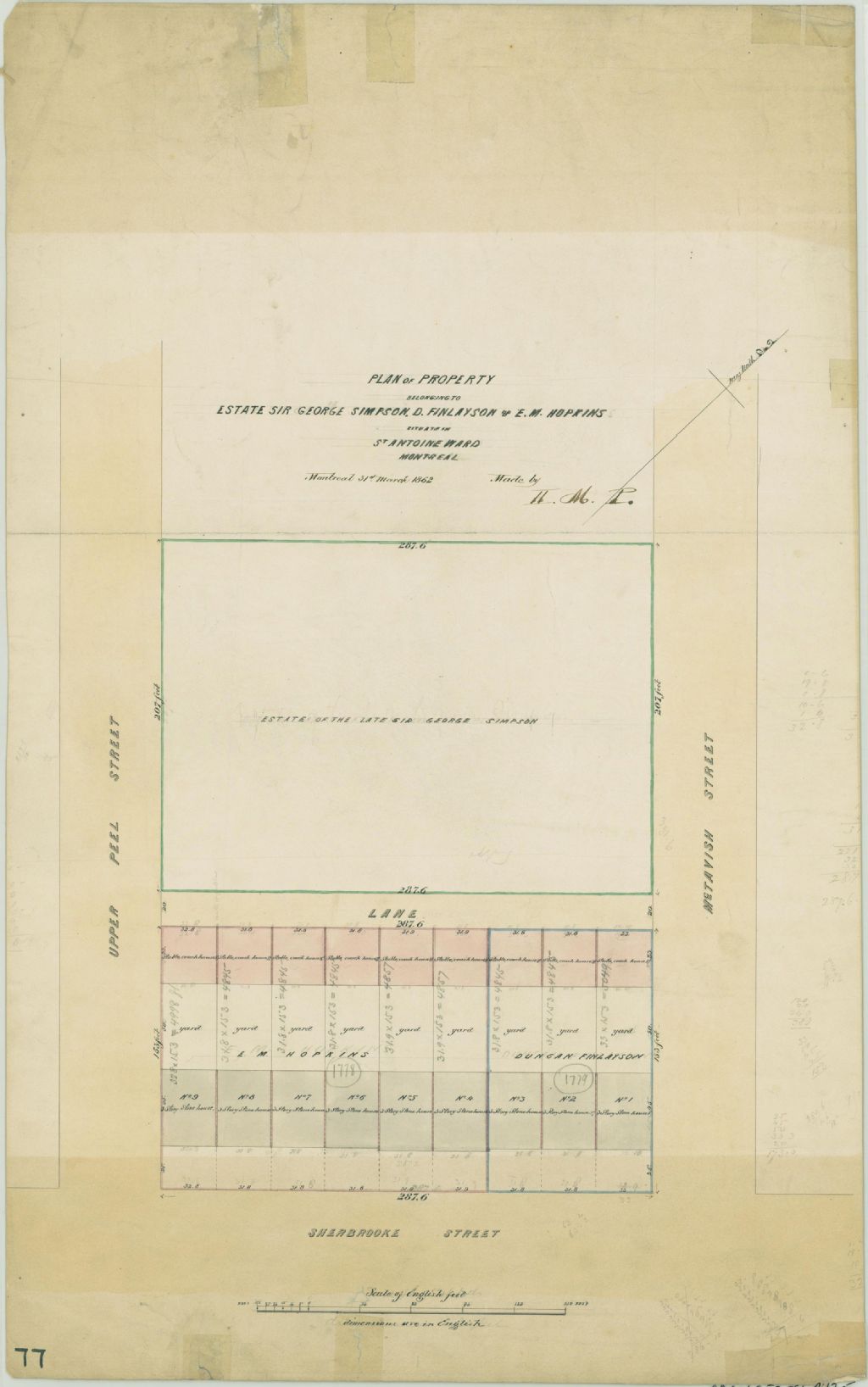 Plan of Property Belonging to Estate Sir George Simpson, D. Finlayson & E. M. Hopkins Situated in St Antoine Ward Montreal