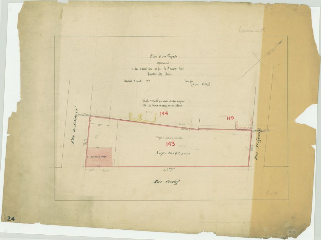 Cette propriété est située sur la rue Craig (devenue Saint-Antoine) entre de Salaberry et Saint-Ignace (devenue Alexandre-Desève) à Montréal. Il s'agit du lot n° 143 du cadastre du quartier Sainte-Marie de la cité de Montréal. Une maison en brique est localisée sur le lot. Les mesures du lot sont indiquées