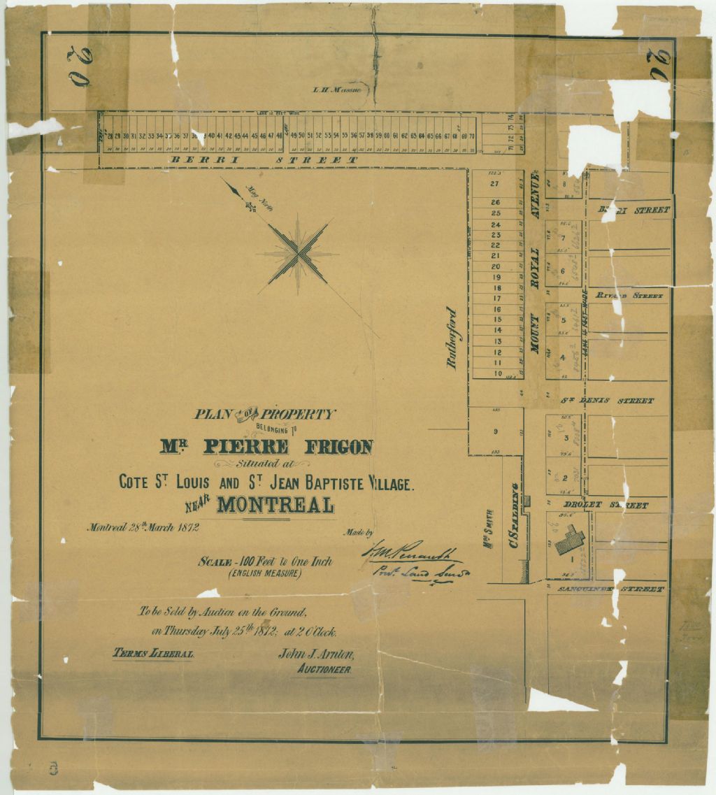 Plan of Property Belonging to Mr. Pierre Frigon Situated at Cote St. Louis and St. Jean Baptiste Village. Near Montreal to be Sold by Auction on the Gound, on Thursday July 25th. 1872; at 2 O'Clock. Terms Liveral. John J. Arnton, Auctioneer