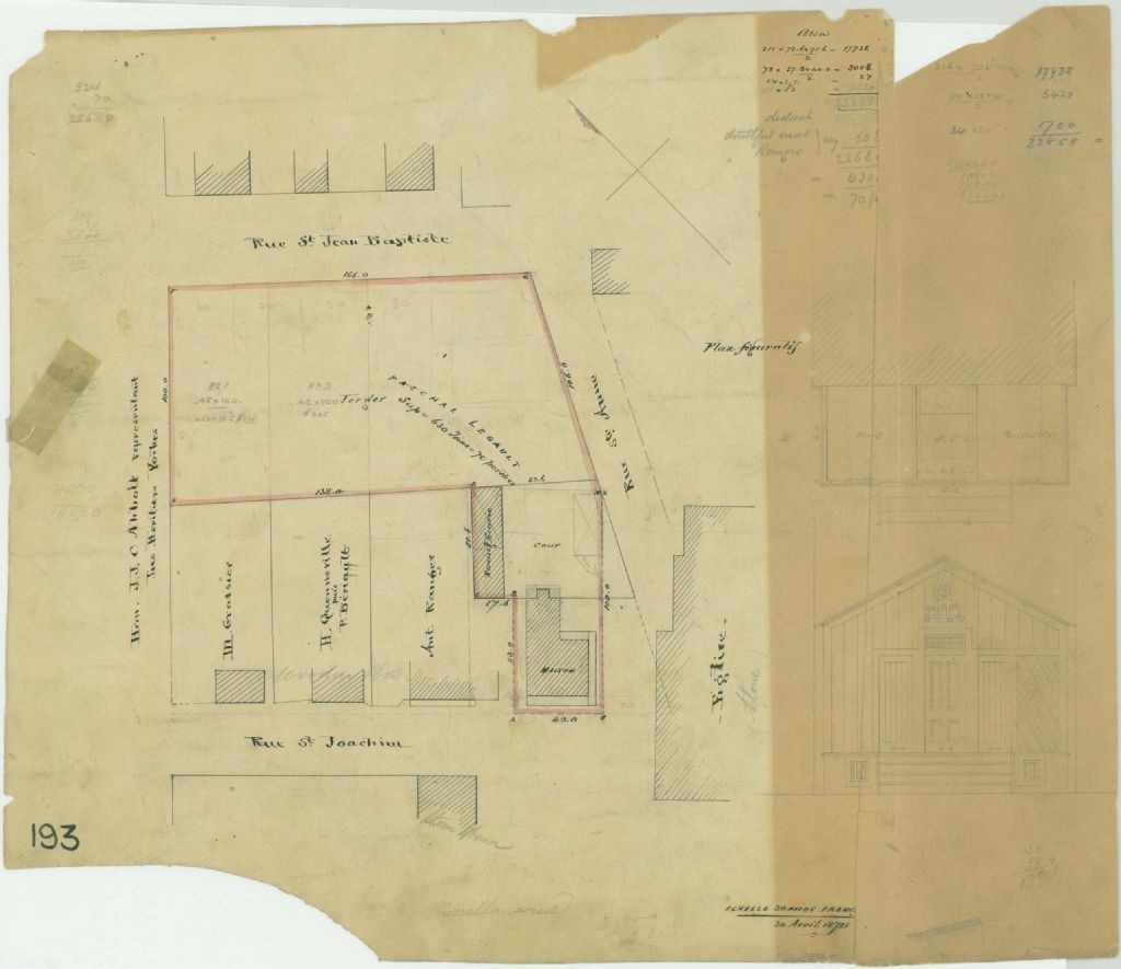 Ce plan présente les lots situés dans le quadrilatère formé par le lot des héritiers Fortier et les rues Saint-Joachim, Sainte-Anne et Saint-Jean-Baptiste à Sainte-Anne-de-Bellevue sur l'île de Montréal. Ce sont les lots n° 89 à 95 du cadastre de la paroisse de Sainte-Anne sur l'île de Montréal.Les propriétaires des lots sont Antoine Ranger, H. Quenneville puis P. Bériault, M. Grassier, J. J. C. Abbott représentant les héritiers Forbes et Paschal Legault. Des résidences sont localisées sur les lots sur la rue Saint-Joachim mais la résidence et la remise-écurie de Paschal Legault est précisée. La localisation de l'Église est indiquée.Les plans de la remise et écurie sont aussi sur le plan. Sur la face du document, nous remarquons : l'élévation du côté de l'édifice ainsi qu'un plan au sol des divisions intérieures; sur le revers, nous voyons : l'élévation de face de l'édifice donnant sur la cour, avec sa lucarne et ses deux chapiteaux; un [...]