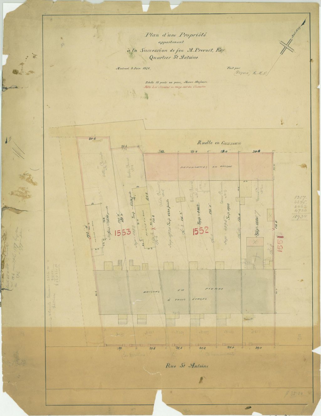 Ce plan présente les lots n° 1552 et 1553 du cadastre du quartier Saint-Antoine de la cité de Montréal. Ces lots sont situés sur la rue Saint-Antoine. Sont localisées sur les lots : des maisons en pierre ainsi que des dépendances en brique sur le lot n° 1552 et en bois sur le lot n° 1553. Les mesures et les superficies de chaque parcelle des lots sont indiquées