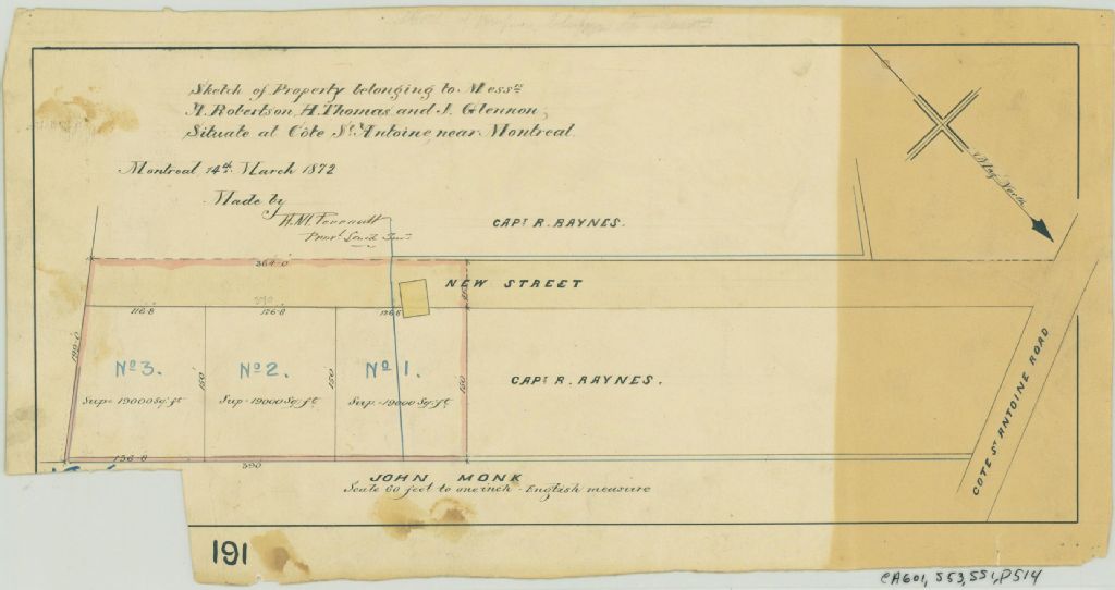Plan of Property Belonging to Messrs. A. Robertson, H. Thomas and J. Glennon Situated at Côte St. Antoine Near Montreal