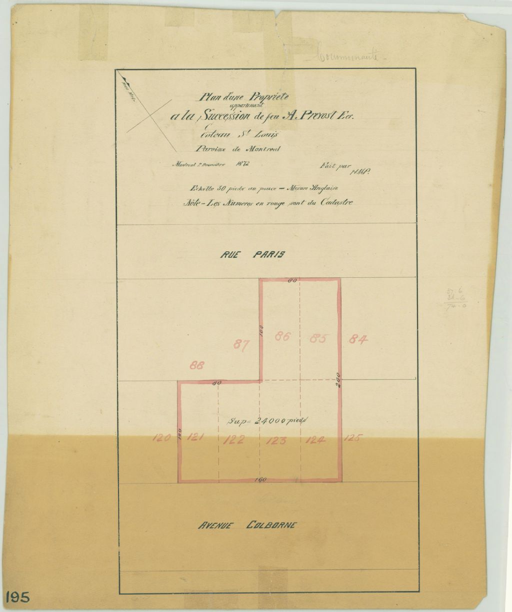 Plan d'une propriété appartenant à la succession de feu A. Prévost écr. Coteau St. Louis Paroisse de Montréal