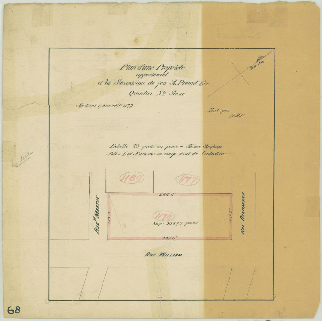 Ce plan présente le lot n° 1178 du cadastre du quartier Sainte-Anne de la cité de Montréal. Ce lot est situé sur la rue William entre les rues Saint-Martin et Richmond à Montréal. Les mesures et la superficie du lot sont indiquées