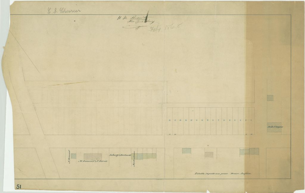 Le plan présente les terrains situés sur la rue Saint-Denis entre les rues Migonnne et Ontario. Cependant, les 16 terrains subdivisés se retrouvent à l'intersection des rues Saint-Denis et Mignonne. Ce sont les lots n° 823 à 838 du cadastre du quartier Saint-Jacques de la cité de Montréal. L'école Saint-Jacques est localisée de l'autre côté de l'intersection et les propriétaires des résidences sur la rue Saint-Denis sont Joseph Trudeau, Laberge & Bertrand, M. Laurent & F. David et J. Brunet. Les mesures des lots subdivisés sont indiquées
