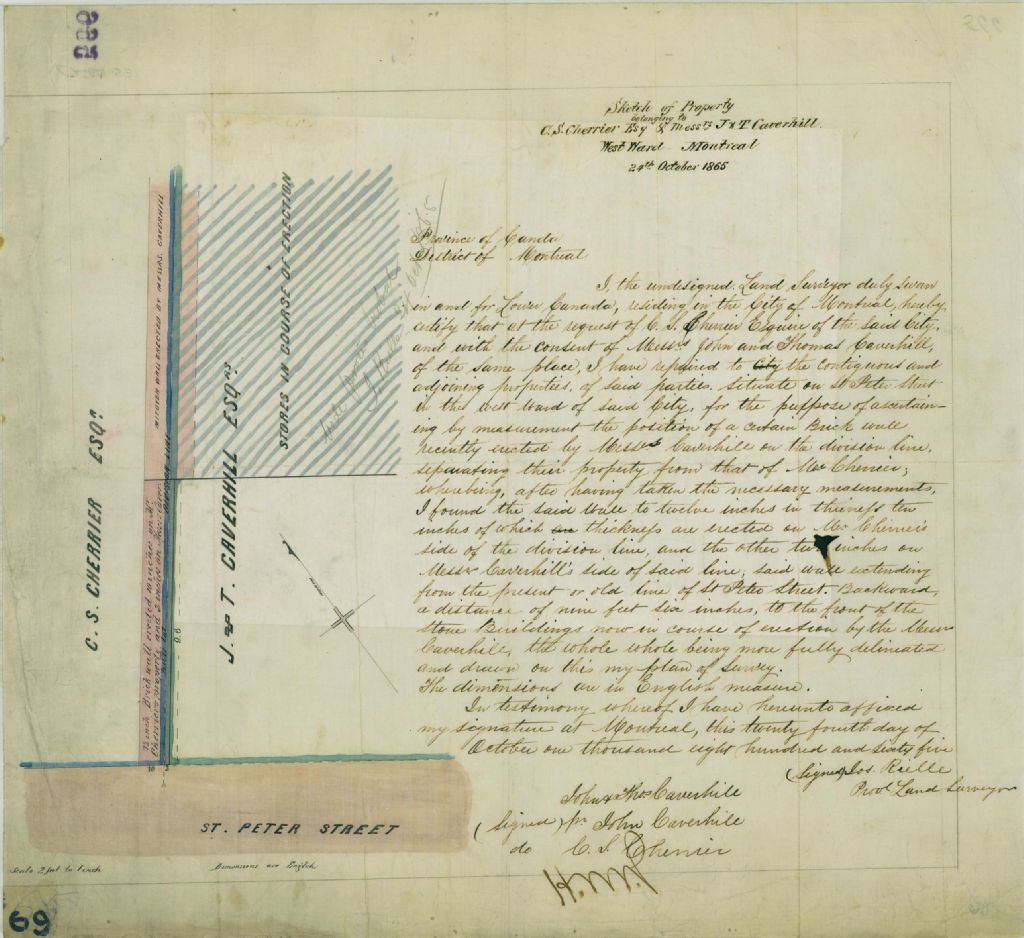 Ce plan présente la ligne de division entre les terrains appartenant à Côme-Séraphin Cherrier et messieurs John et Thomas Caverhill. Ces terrains sont situés sur la rue Saint-Pierre à Montréal, entre les lots n° 108 et 109 du cadastre du quartier Ouest de la cité de Montréal. Le procès-verbal de l'arpentage fait par Joseph Rielle est présent sur le plan. Les mesures du mur mitoyen et des magasins en construction sont indiquées