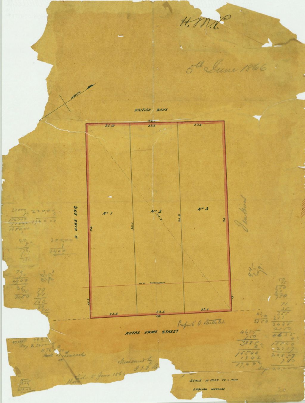 Plan de la propriété appartenant à O. Berthelet sur la rue Notre-Dame à Montréal