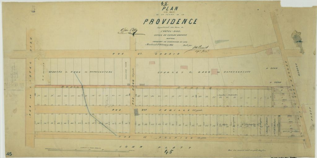 Ce plan présente la propriété des Soeurs de l'Hôtel-Dieu. Cette propriété est située dans le quadrilatère formé par les rues Sherbrooke, Saint-Sulpice (devenue Jeanne-Mance), de l'Hôtel-Dieu (devenue avenue des Pins) et Saint-Urbain à Montréal. Ce sont les lots n° 20 à 42B et 77 à 104 du cadastre du quartier Saint-Laurent de la cité de Montréal. Les voisins sont Stanley C. Bagg ou ses représentants, A. Shaw, A. Voyer et John Platt. Les mesures des lots sont indiquées