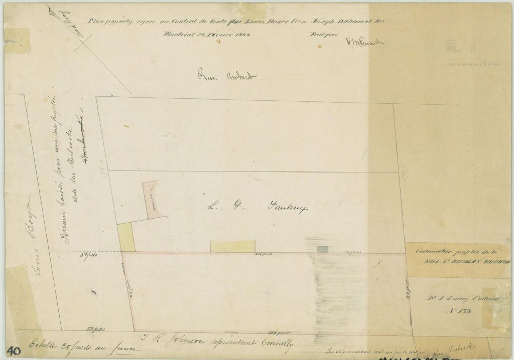 Ce plan présente un lot situé à l'intersection des rues Sherbrooke et Amherst à Montréal. Il s'agit du lot n° 1165 du cadastre du quartier Saint-Jacques de la cité de Montréal. Une résidence avec ses dépendances est localisée sur le lot appartenant à L. G. Fauteux. La rue Saint-Nicolas-de-Tollentin (devenue Saint-Timothée) est indiquée sur le plan. Les voisins sont Dr. J. Emery Coderre, J. R. Johnson représentant Monsieur Connely et Louis Boyer. Les mesures du lot mis en vente sont indiquées