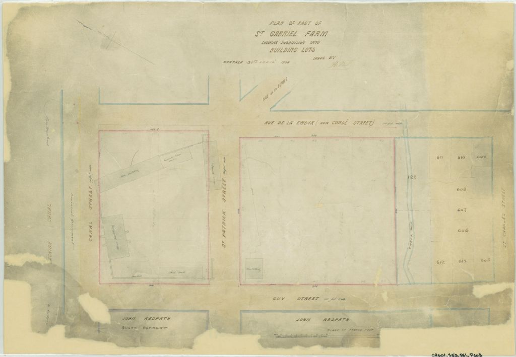 Ce plan présente une partie de la Ferme Saint-Gabriel comprise dans le quadrilatère formé par les rues du Canal (disparue depuis), de la Croix (devenue Condé), Saint-Charles (devenue Richardson) et Guy (devenue Montmorency) à Montréal. Ce sont les lots n° 699 à 744 du cadastre de la municipalité de la paroisse de Montréal. Sont localisés entre le Canal Lachine et la rue Saint-Patrick des édifices en pierre, une remise en bois et un atelier de menuiserie. Le voisin est la raffinerie de sucre John Redpath. Un ruisseau traverse les lots près de la rue Saint-Charles (devenue Richardson). Les numéros figurant sur les lots le long de cette rue ne correspondent à aucun cadastre. Les mesures des lots sont indiquées