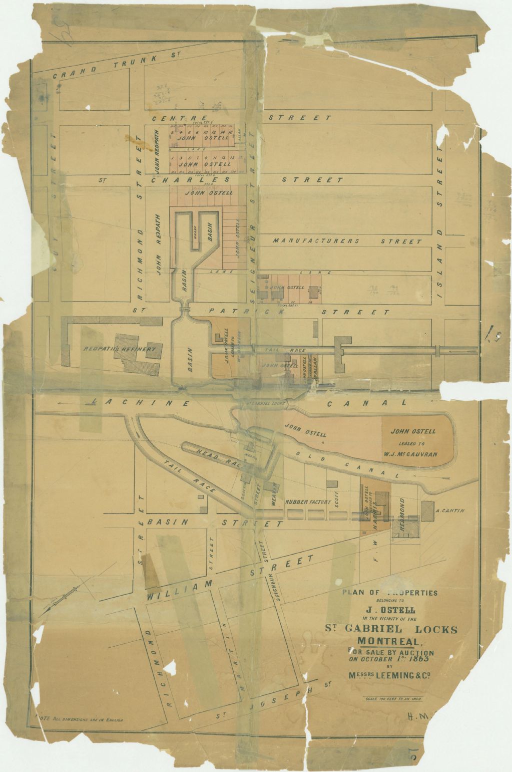 Plan of Properties Belonging to J. Ostell in the Vicinity of the St. Gabriel Locks Montreal for Sale by Auction on October 1 st. 1863 by Messrs. Leeming & Co