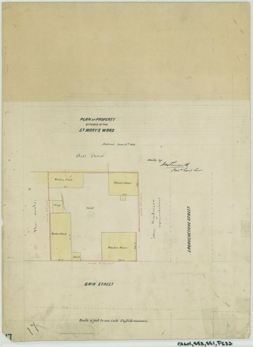Ce plan présente une propriété appartenant à monsieur D. Masson. Cette propriété est située à l'intersection des rues Gain (devenue Cartier) et Lagauchetière à Montréal. Il s'agit du lot n° 213 du cadastre du quartier Sainte-Marie de la cité de Montréal.Sont localisées sur le plan deux maisons, deux remises en bois et une toilette extérieure. Les voisins sont Thomas Scales, Alexander Shaw et John Henderson ou ses représentants. Les mesures du lot sont indiquées