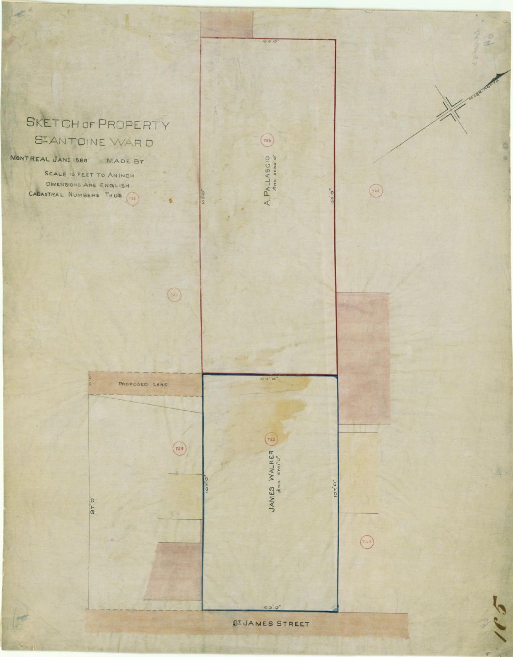 Plan des propriétés de messieurs James Walker et A. Pallascio sur la rue Saint-Jacques à Montréal. Ce sont les lots n° 725 et 726 du cadastre du quartier Saint-Antoine de la cité de Montréal. Les mesures et superficies des lots sont indiquées