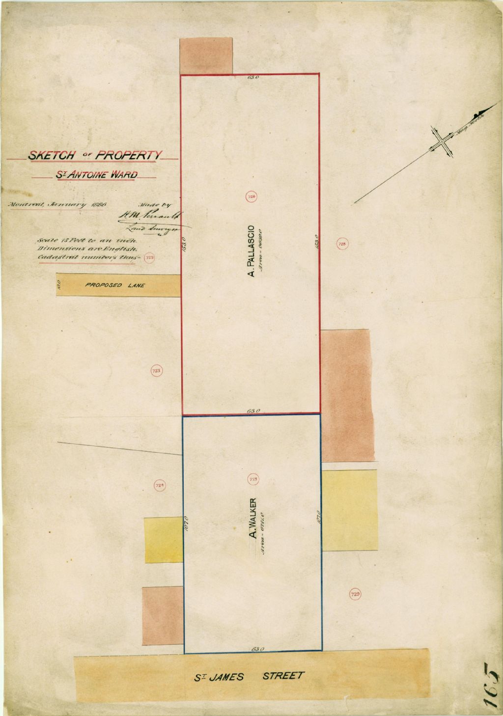Plan des propriétés de messieurs James Walker et A. Pallascio sur la rue Saint-Jacques à Montréal. Ce sont les lots n° 725 et 726 du cadastre du quartier Saint-Antoine de la cité de Montréal. Les mesures et superficies des lots sont indiquées