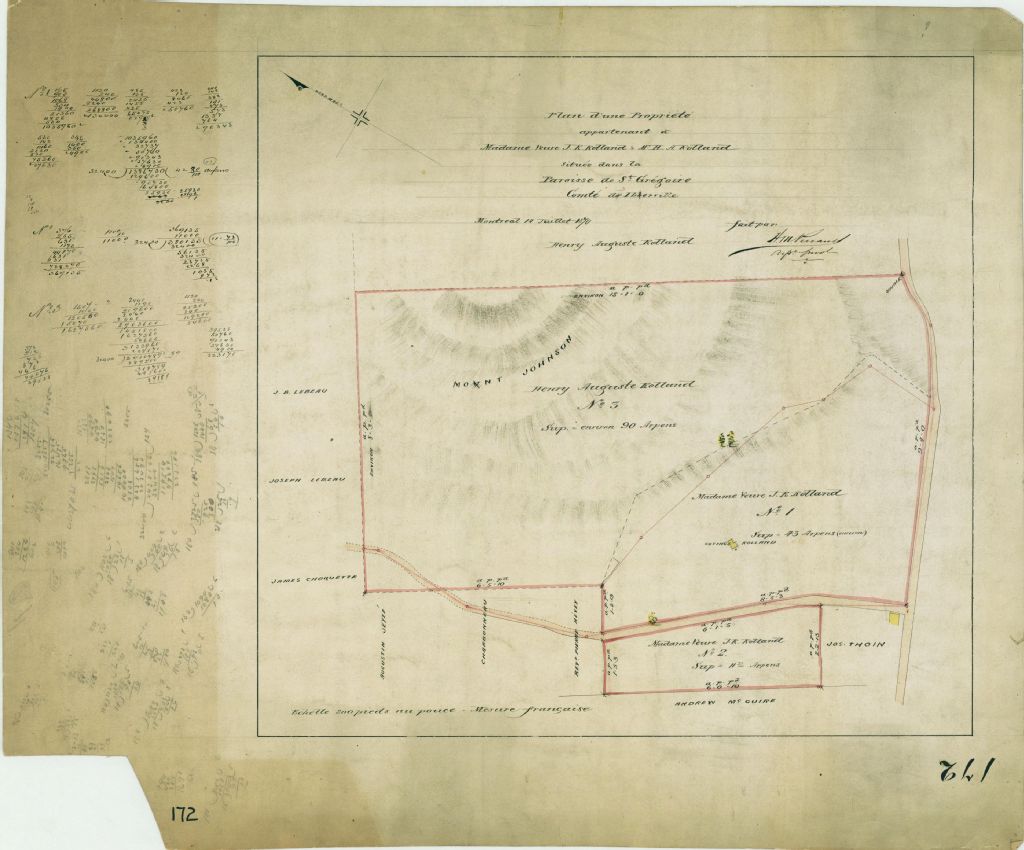 Plan d'une propriété appartenant à madame veuve J. R. Rolland et m. H. A. Rolland située dans la paroisse de St. Grégroire comté d'Iberville
