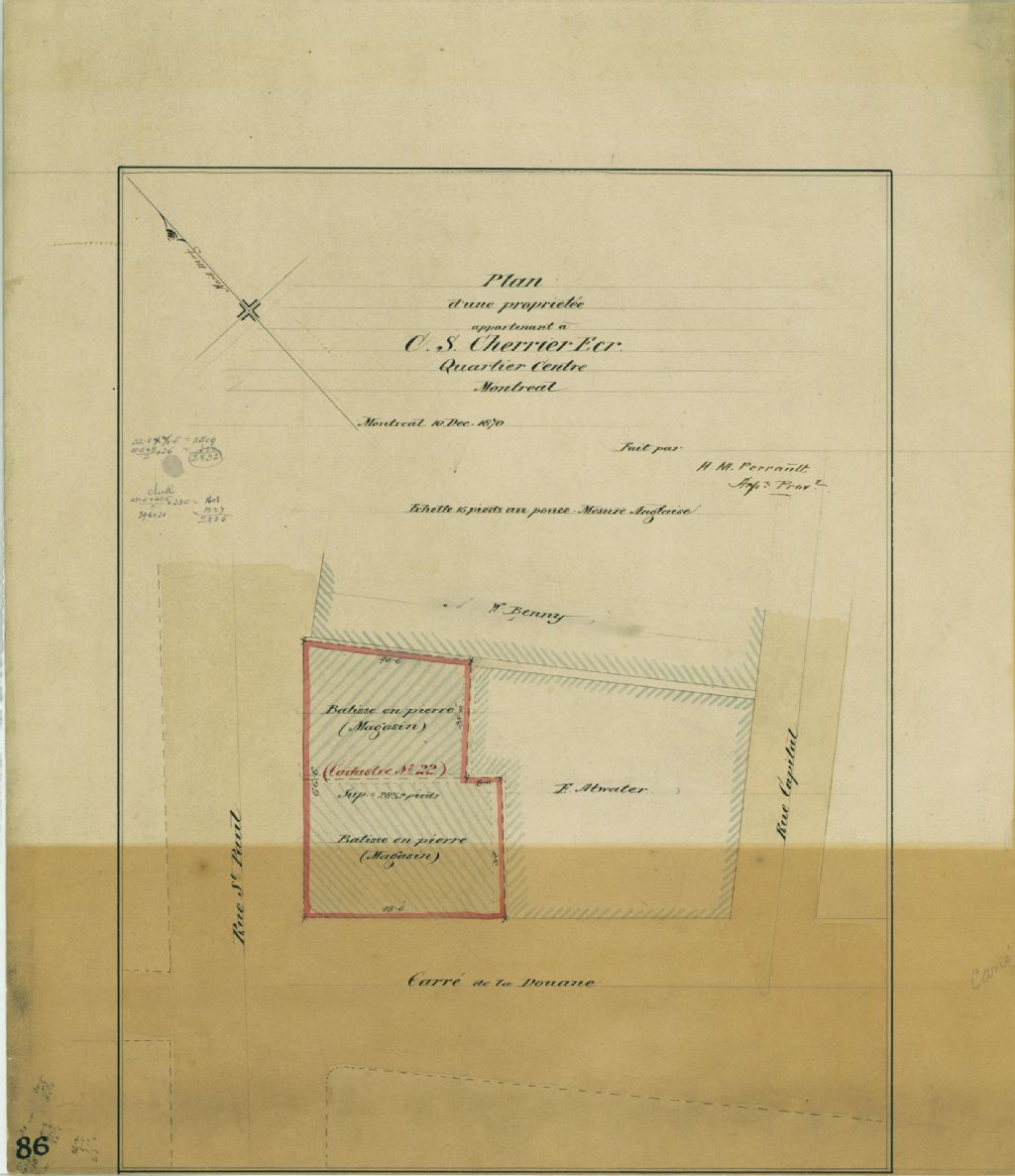 Le plan présente le lot n° 22 du cadastre du quartier Centre de la cité de Montréal. Ce lot est situé à l'intersection des rues Saint-Paul et Carré de la Douane (devenu Place Royale) à Montréal. Deux magasins en pierre sont localisés sur le lot. Les voisins sont W. Benny et F. Atwater. Les mesures et la superficie du lot sont indiquées