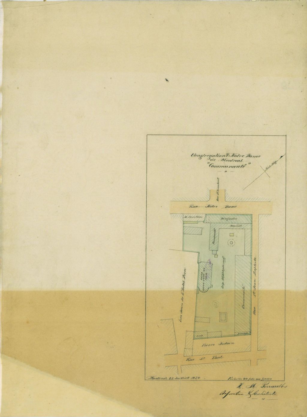 Le plan présente la propriété des Soeurs de la Congrégation de Notre-Dame de Montréal. Cette propriété est située entre les rues Notre-Dame, Saint-Jean-Baptiste et Saint-Paul à Montréal. Il s'agit du lot n° 61 du cadastre du quartier Centre de la cité de Montréal.Sont localisés sur le plan l'église Notre-Dame-de-Pitié, la Communauté, les magasins, le noviciat, le pensionnat, un puits, une écurie et d'autre édifices. Monsieur Cuvillier possède une résidence, attenante au lot, sur la rue Notre-Dame et monsieur Pierre Jodoin possède une partie du lot le long de la rue Saint-Paul. La rue Saint-Lambert (devenue boulevard Saint-Laurent) sera continuée, plus tard, à travers cet emplacement jusqu'à la rue de la Commune. La superficie du lot est indiquée