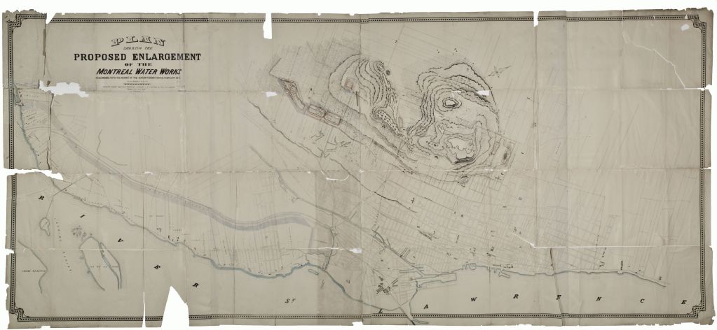 - Ce plan présente l'élargissement de l'aqueduc de la Ville de Montréal. Ce projet sera entrepris selon le rapport du superintendant Louis Lesage. La prise d'eau se trouve à Lachine et le canal se prolonge jusqu'à la rivière Saint-Pierre près de Verdun. Les noms des propriétaires des lots traversés sont indiqués. Des réservoirs sont prévus de part et d'autre ainsi que sur le Mont Royal. Les capacités de chaque réservoir sont prévues. Dans la ville de Montréal, le réservoir McTavish et celui près de la rue Saint-Denis sont identifiés. La canalisation maîtresse reliant ces réservoirs est localisée à travers la ville.Des maisons et autres édifices sont localisés le long de la rue Lower Lachine Road (devenue boulevard La Salle) dans Lachine et Verdun. Les îles aux Hérons et au Diable sont localisées dans le fleuve Saint-Laurent. Dans la ville de Montréal, plusieurs édifices sont localisés et la gare Bonaventure est identifiée. Le tracé du canal Lachine depuis le port jusqu'à Côte Saint-Paul est précisé. La nouvelle limite de la ville qui englobe le Mont Royal est indiquée. Les courbes de niveau du Mont Royal sont tracées