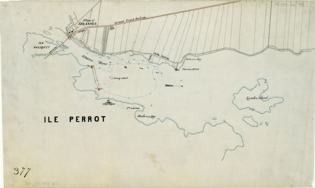 Ce plan indique le village de Sainte-Anne-de-Bellevue sur l'île de Montréal, l'île Perrot et, dans la rivière Outaouais, les îles Valiquet, Grassy et Lynch ou Sainte-Geneviève. Le tracé du chemin de fer du Grand Tronc, avec l'emplacement de l'ancienne et de la nouvelle gare, est indiqué ainsi le chemin public (devenu rue Sainte-Anne) le long de la rivière des Outaouais. L'élévation et l'emplacement du Collège Moffat, sur l'île Perrot, est indiqué ainsi que quelques autres points de repères. Quelques bouées et des lignes de profondeurs sont indiquées dans le lit de la rivière. Seul le lot de monsieur H. Hutton est localisé près de la Pointe-à-Caron sur l'île de Montréal. Quatre phares lumineux avec un tracé pour le passage des bateaux complètent le plan