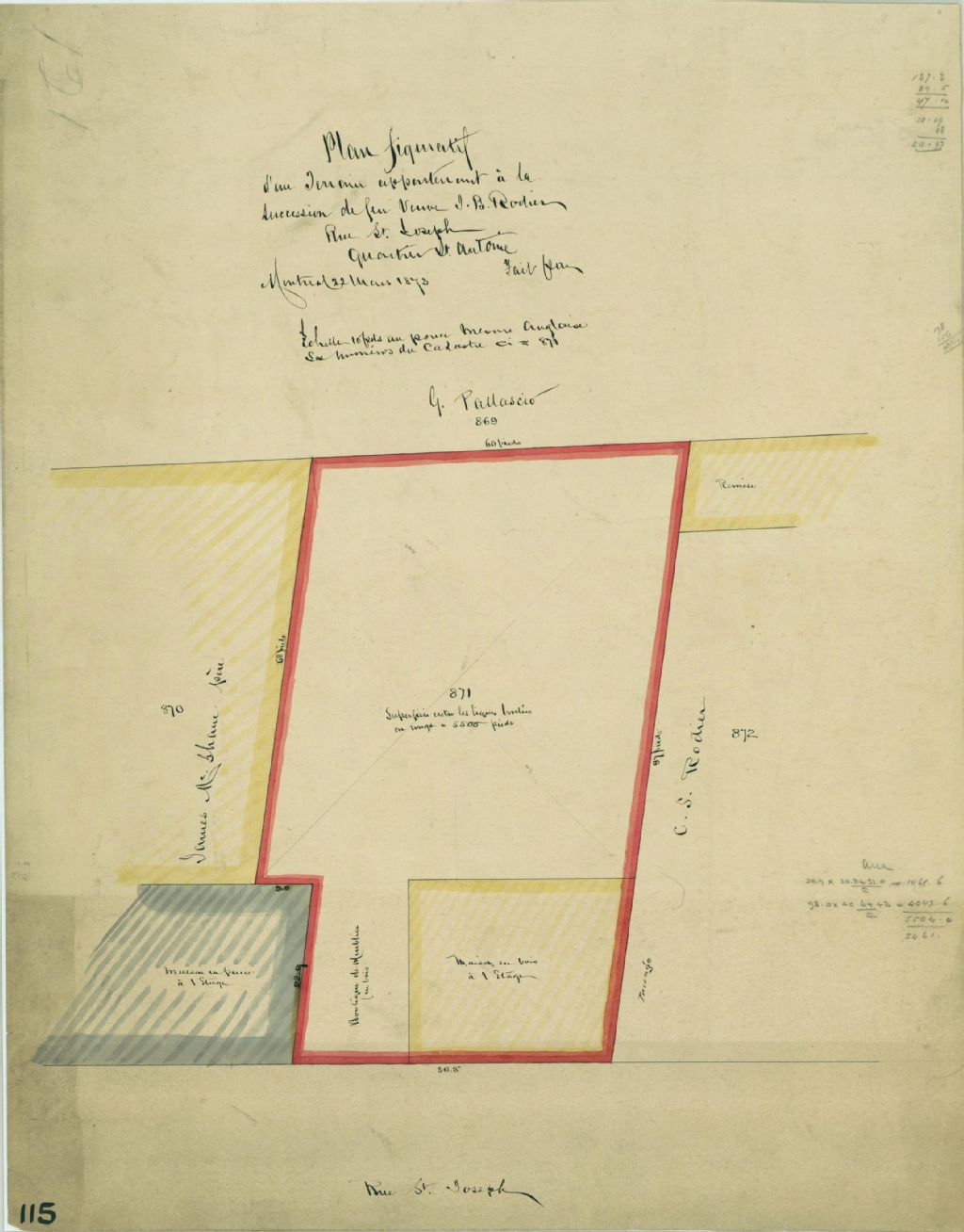 Plan figuratif d'un terrain appartenant à la succession de feu veuve J. B. Rodier rue St. Joseph quartier St. Antoine