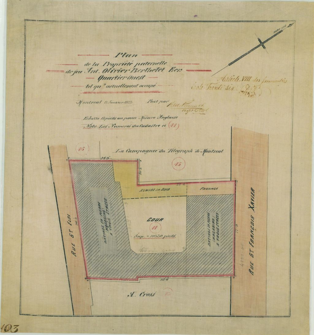 Plan de la propriété paternelle de feu Ant. Olivier Berthelet écr. quartier ouest tel qu'actuellement occupé