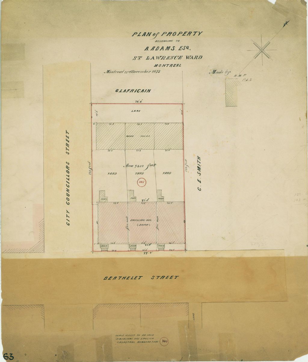 Ce plan présente le lot n° 205 du cadastre du quartier Saint-Laurent de la cité de Montréal. Ce lot appartient à A. Adams et situé à l'intersection des rues Berthelet et City Councillors à Montréal.Le lot est divisé en trois sections. Sont localisées sur le lot trois maisons en brique et trois remises en bois. Les voisins sont G. Lafricain et C. E. Smith. Les mesures et la superficie de l'ensemble et les mesures des parties du lot sont indiquées