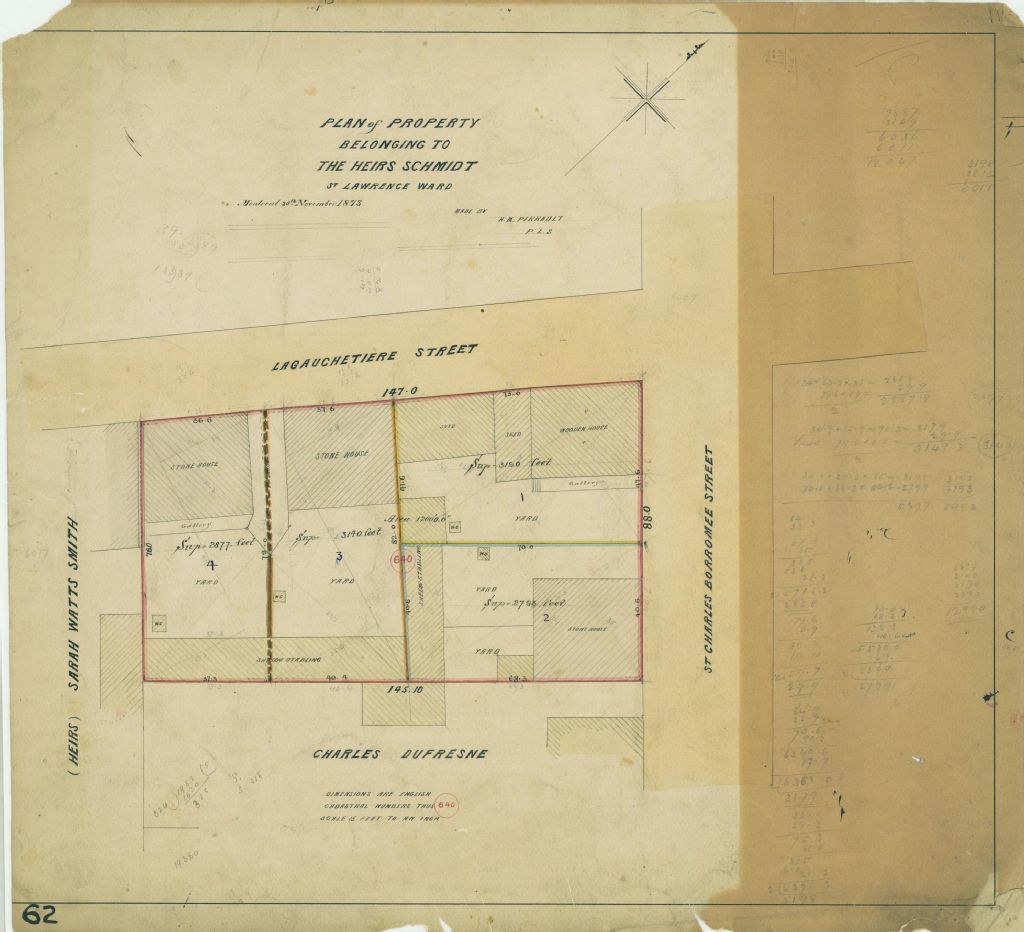 Ce plan présente le lot n° 640 du cadastre du quartier Saint-Laurent de la cité de Montréal. Ce lot appartient aux héritiers Schmidt et est situé à l'intersection des rues Lagauchetière et Saint-Charles-Borromée (devenue Clark) à Montréal.Sont localisées sur chacune des quatre parties du lot une maison en pierre, une remise et étable et une toilette extérieure. Les voisins sont Charles Dufresne et les héritiers de Sarah Watts Smith. Les mesures de chaque subdivision et la superficie du lot sont indiquées