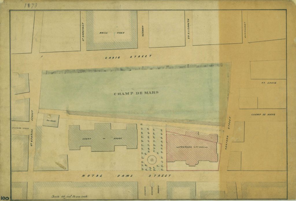 Plan de localisation du Palais de Justice, du Champ de Mars et de l'emplacement du futur Hôtel de ville de Montréal