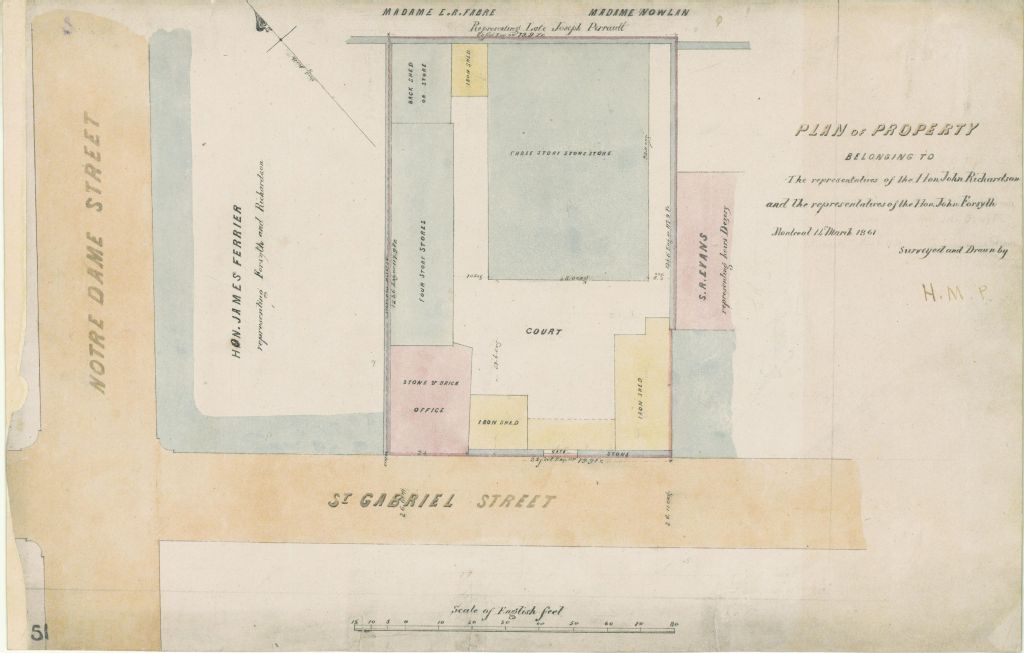 Plan de la propriété appartenant aux représentants de l'honorable John Richardson et à ceux de l'honorable John Forsyth. Cette propriété est située à l'intersection des rues Notre-Dame et Saint-Gabriel à Montréal et avoisine les propriétés de madame E. R. Fabre, de Madame Nowlan, représentant la succession Joseph Perrault, et de S. R. Evans, représentant les héritiers Dezery. Ce sont les n° 110,111 et 115 du cadastre du quartier Est de la ville de Montréal. Ce plan indique également l'emplacement d'édifices en pierre, de magasins, de bureaux, de remises à ferraille et de hangars