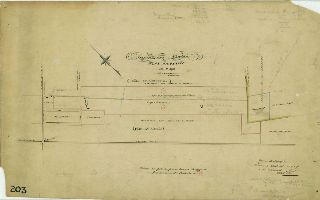 Ce plan représente un terrain appartenant à la succession Nowlan. Ce terrain est situé près de la rue Mont-Royal et des terrains de l'Exhibition à Montréal. Ce sont les lots n° 12 à 14 du cadastre du village de la Côte-Saint-Louis et les n° 29 à 32 du cadastre de la municipalité de la paroisse de Montréal.Le lot va jusqu'au trait carré de la limite de la paroisse de Saint-Laurent. Des édifices sont localisés sur le lot de la succession Nowlan. Le terrain de l'Exhibition est aussi localisé. Les voisins sont les héritiers de feu Charles J. Dunlop, de feu Stanley C. Bagg, E. J. Penny, Emery Tessier dit Lavigne et de Madame Hall. Un édifice indique le Mile End situé à l'intersection de l'avenue du MontRoyal et du chemin public (devenu le boulevard Saint-Laurent) à Montréal
