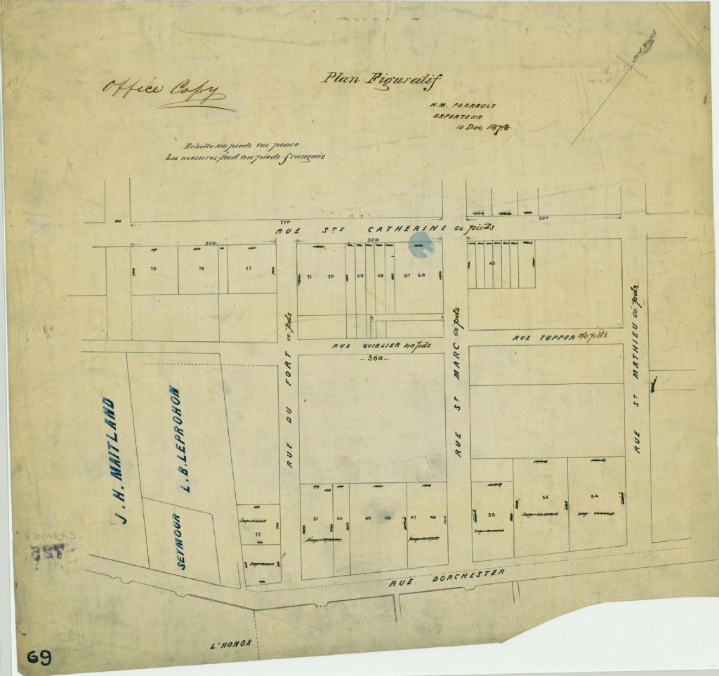Ce plan présente les terrains situés dans le quadrilatère formé par les rues Saint-Mathieu, Dorchester (devenue boulevard René-Lévesque), du Fort et Sainte-Catherine à Montréal. Certains lots sont numérotés de façon discontinue de 34 à 79. À l'extérieur du quadrilatère, les propriétaires de certains lots sont identifiés : Monsieur Seymour, J. H. Maitland et L. B. Leprohon. Des mesures et des superficies de certains lots ont été indiquées mais biffées par la suite