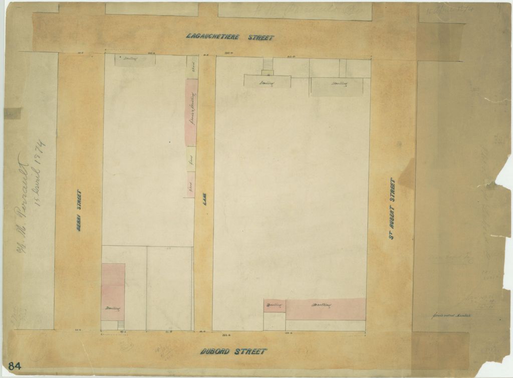 Plan d'une propriété appartenant à H. M. Perrault, bornée par les rues Dubord, Berri, Lagauchetière et Saint-Hubert