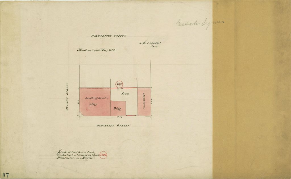 Ce plan présente le lot n° 1192 du cadastre du quartier Saint-Antoine de la cité de Montréal situé à l'intersection des rues Aylmer et Berthelet à Montréal. Le lot est divisé en au moins deux parties. Sont localisées sur une partie du lot une résidence en brique de trois étages, une étable et entrepôt. Les mesures de cette partie du lot sont indiquées