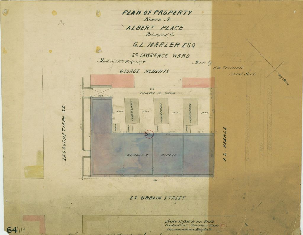 Ce plan présente la propriété de G. L. Marler, propriété connue sous le nom de Albert Place. Il s'agit du lot n° 571 de cadastre du quartier Saint-Laurent de la cité de Montréal. Ce lot est situé à l'intersection des rues Saint-Urbain et Lagauchetière à Montréal. Sont localisées sur le lot des résidences et des remises et étables. Les voisins sont George Roberts et J. G. Hearle. Les mesures du lot sont indiquées
