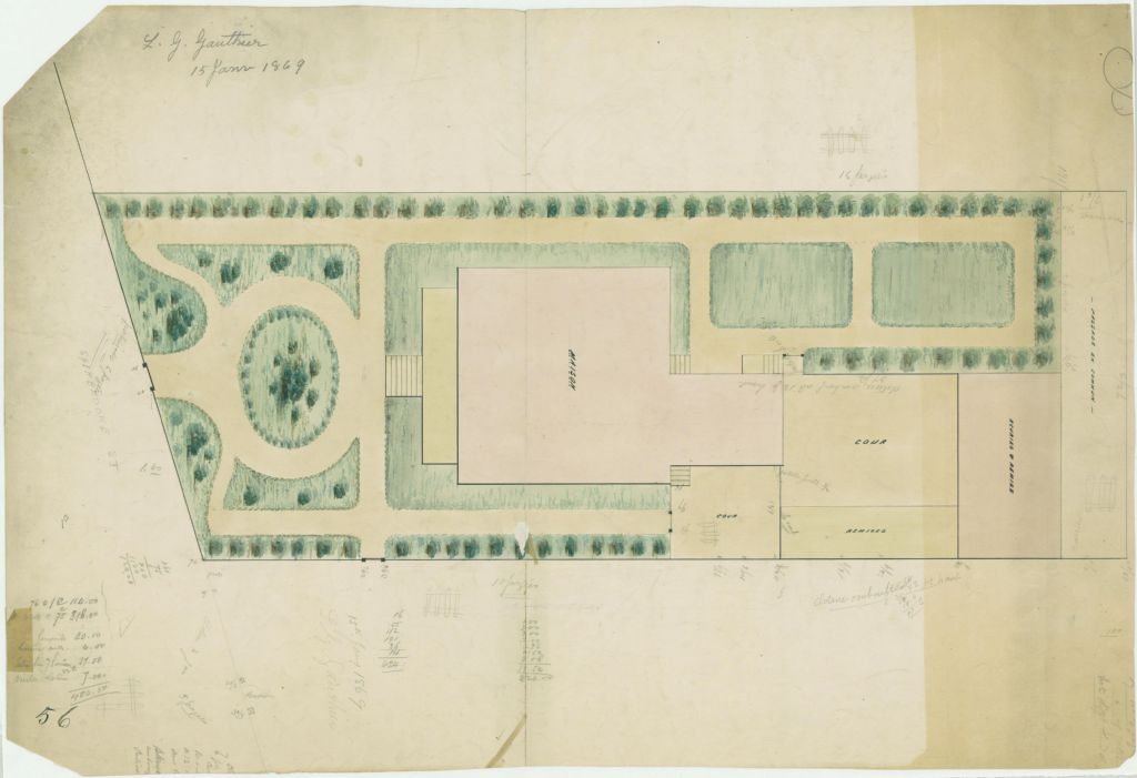 Ce plan présente l'emplacement de la résidence et des jardins appartenant à L. J. Gauthier. Cette résidence est située sur la rue Sherbrooke à Montréal. Il s'agit du lot n° 1205 du cadastre du quartier Saint-Louis de la cité de Montréal.Sont localisés sur le lot la résidence, l'entrée, un jardin, une remise et une remise et écuries. Les mesures du lot sont indiquées